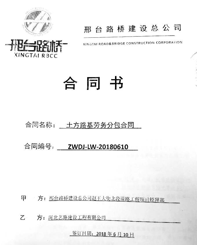工程名称:邯郸赵王大街;施工内容:土方路基施工;施工时间:2018年6月10日-2018年11月10日;合同金额:2293674.57元。
