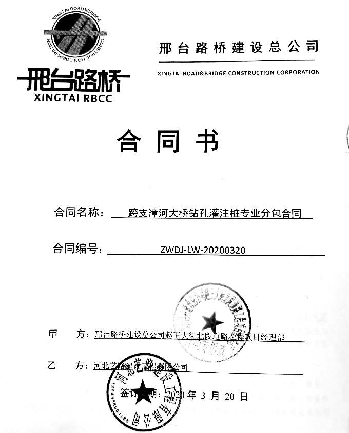 工程名称:邯郸赵王大街(支漳河大桥)工程;施工内容:跨支漳河大桥钻孔灌注桩施工;施工时间:2020年3月20日-2020年6月30日;合同金额:2667990元。