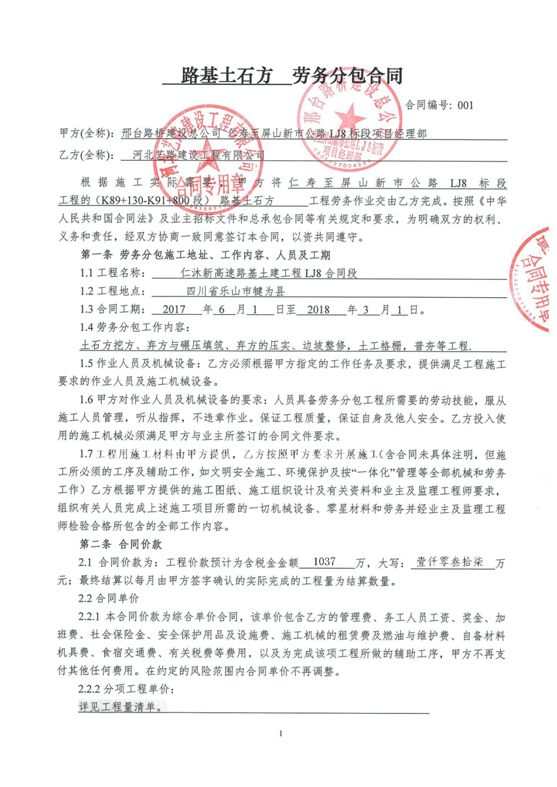 工程名称:四川仁沐新高速公路LJ8标路基工程;施工内容:路基土石方施工;施工时间:在建;合同金额:1037万元